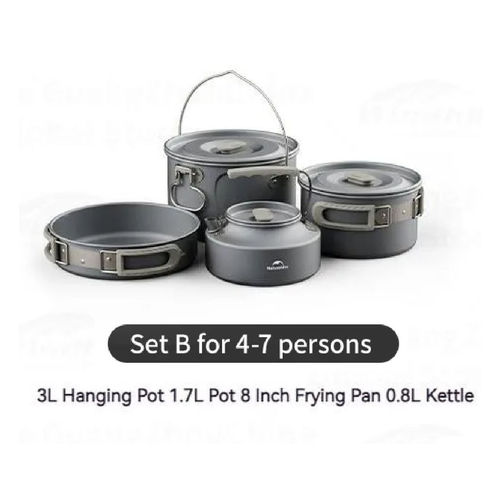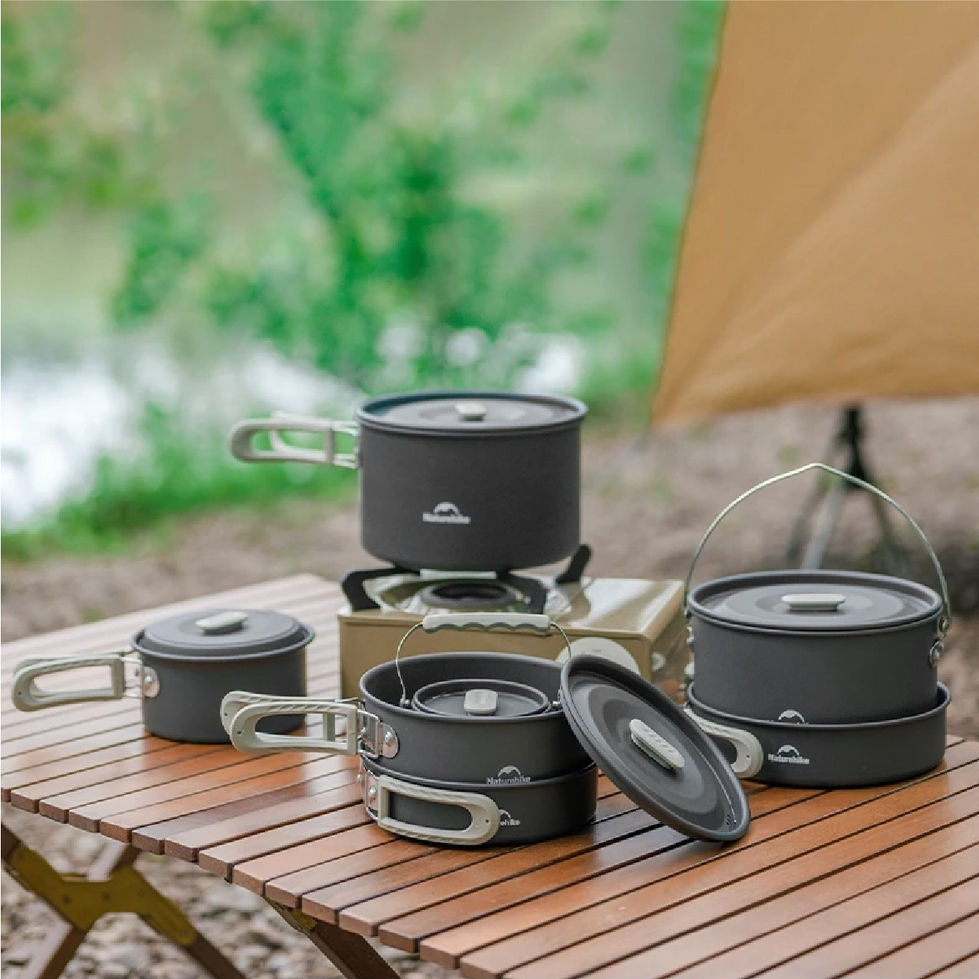 Naturehike Aluminium Alloy Pot Set ชุดเครื่องครัวอลูมิเนียม Naturehike เหมาะสำหรับ 2 - 7 คน ประกอบด้วยหม้อ กาน้ำชา กระทะทอด สามารถซ้อนเก็บได้ เหมาะสำหรับการทำอาหารกลางแจ้ง ปรุงซุป ทอดอาหาร และต้มน้ำระหว่างการตั้งแคมป์ หรือ ไปเที่ยวกับครอบครัว