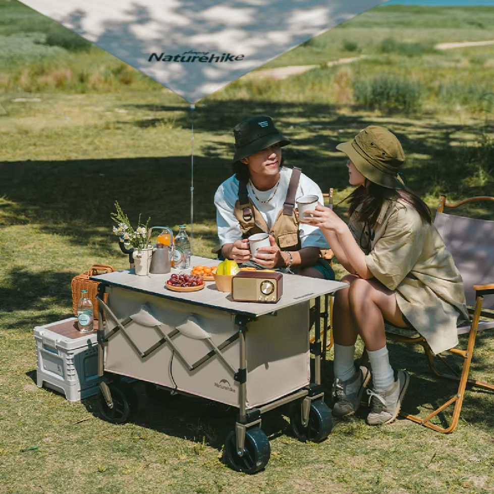 Naturehike Folding Camping Cart 70L / 100L (CNK2350JJ012) รถเข็นพับได้น้ำหนักเบา สามารถรับน้ำหนักที่เหนือกว่า มีความทนทาน และขนอุปกรณ์ตั้งแคมป์ได้ง่าย ด้ามจับแบบยืดหดได้ด้วยการกดเพียงครั้งเดียว ช่วยให้ปรับความสูง และมุมได้ ทำให้ใช้งานง่ายขึ้น การผสมผสานระหว่างผ้า Oxford และเหล็กกล้าคาร์บอนช่วยให้ทั้งทนทานและน้ำหนักเบา จึงเป็นเพื่อนร่วมทางที่เหมาะสำหรับการผจญภัยกลางแจ้ง