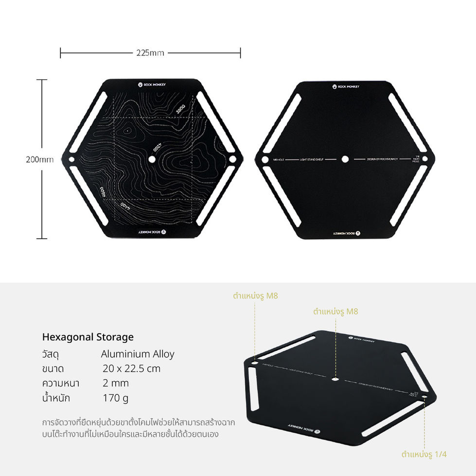 Rock Monkey Hexagonal Storage Board for Light Stand ชั้นวางของทรงหกเหลี่ยม พร้อมร่องสำหรับ แขวน สามารถแขวนแก้วน้ำ และโคมไฟขนาดเล็ก Hexagonal Storage เป็นตัวช่วยที่ยอดเยี่ยมสำหรับการผจญภัยกลางแจ้ง