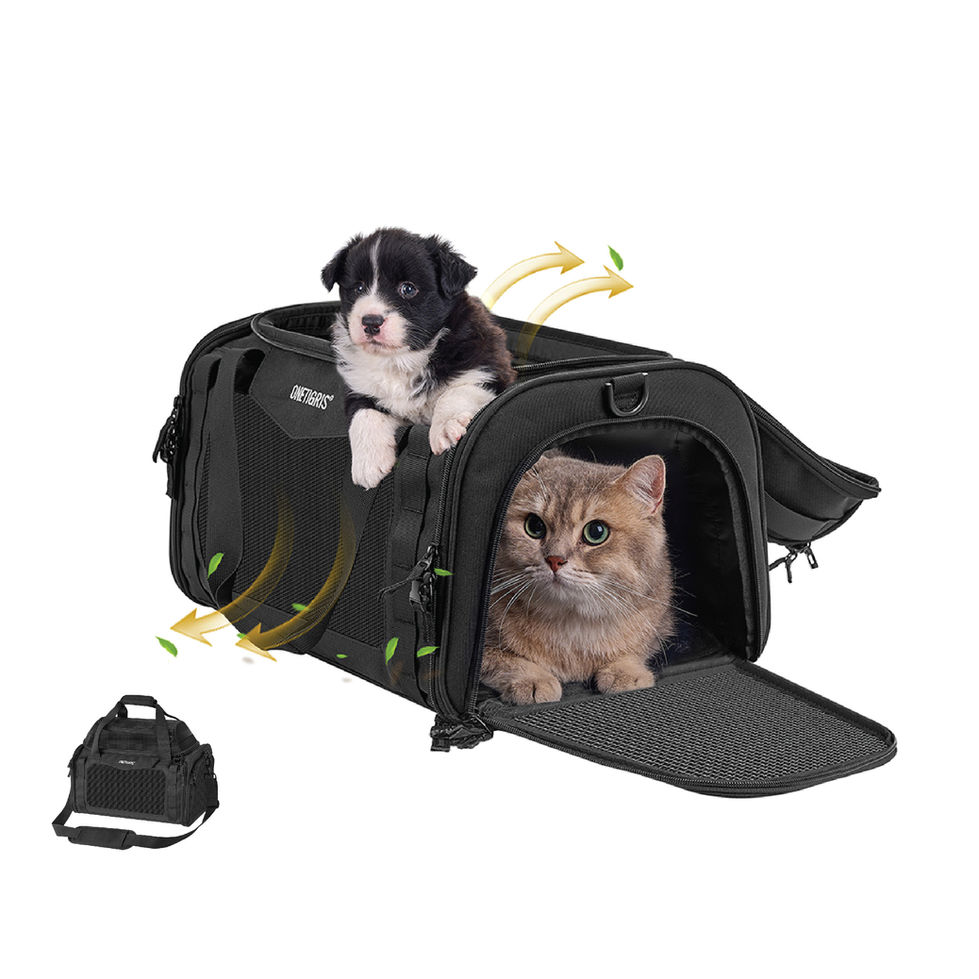 TSA-approved, airline-compliant soft carriers for furry travelers now available! This carrier fits next to or under the seat on a plane for most airlines (Alaska Airlines, Southwest Airlines, Delta Airlines, United Airlines, American Airlines, Air Canada, etc.) and uses premium quality PVC fabric, mesh fabric, and YKK® snag-free zippers for a secure and comfortable journey. Weighing only 3lb (1.35kg), it’s designed for pets weighing up to 15lb (6.8kg), with mesh windows on all 4 sides and the top for good airflow and visibility of your furry companion.