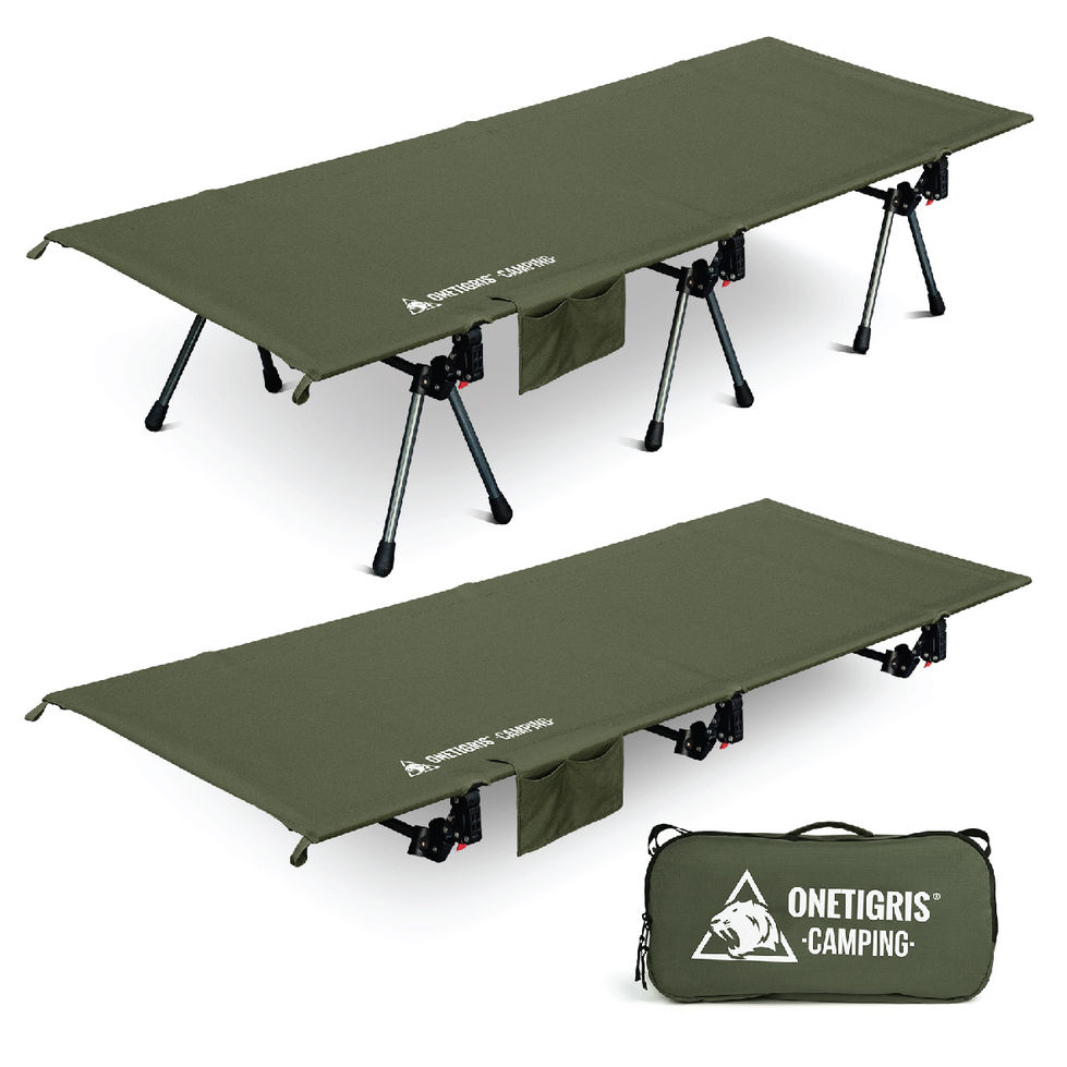 OneTigris Supranubis Camping Cot เตียงสนามที่นุ่มสบาย มีความสำคัญมากกว่าการนอนบนพื้นพร้อมเสื่อรองนอน เตียงนี้สามารถใช้งานได้บนพื้นที่ไม่เรียบโดยไม่ต้องเสียเวลาเลือกพื้นที่ตั้งแคมป์ที่สมบูรณ์แบบมากเกินไป โครงสร้างแบบแท่งที่ออกแบบใหม่ทำให้การติดตั้งขาเตียงเป็นเรื่องง่ายมาก ด้วยโครงสร้างอะลูมิเนียมเกรดอากาศยานที่แข็งแกร่งเป็นพิเศษ จึงรองรับน้ำหนักได้ถึง 150 กิโลกรัม ขาเตียงที่ขยายออกช่วยให้คุณสามารถปรับระดับความสูงหรือ ต่ำของเตียงได้ตามความต้องการ